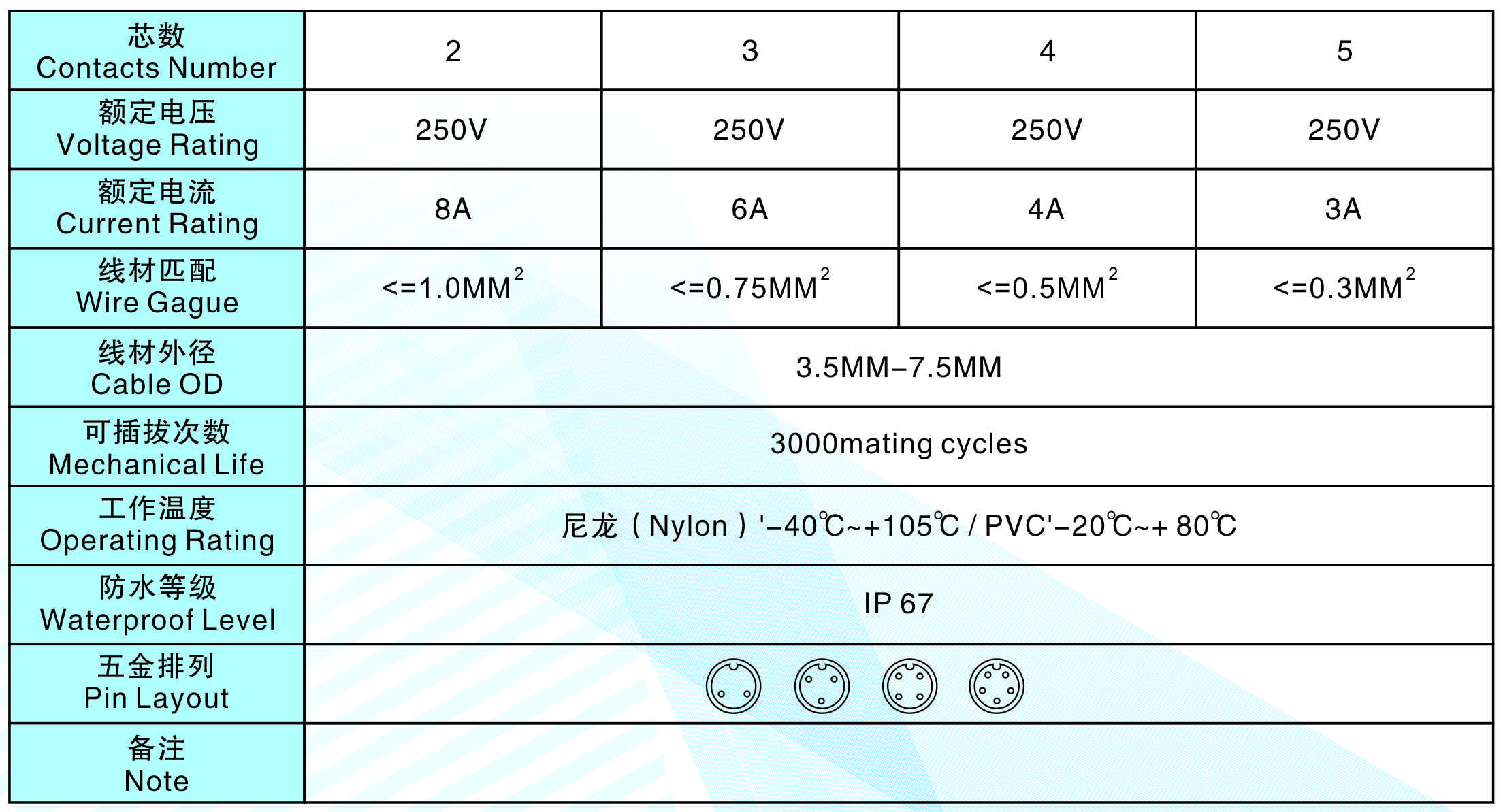 線材匹配(Wire Gague):<=1.0MM2 <=0.75MM2 <=0.5MM2 <=0.3MM2